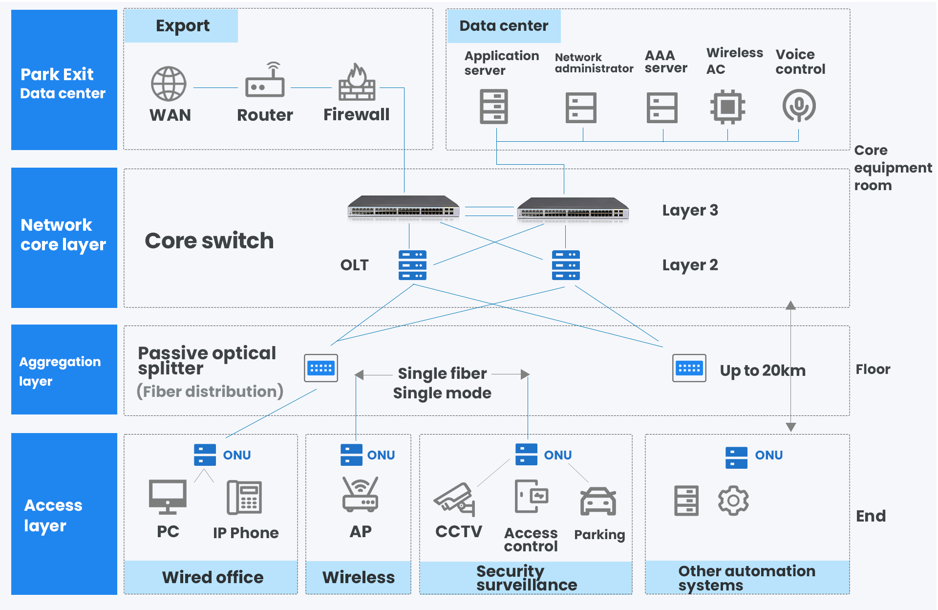 A single fiber optic cable can simultaneously carry multiple services such as data, voice, video surveillance, Wi-Fi backhaul, access control, and building automation. Through the OLT's VLAN and QoS policies, the following are achieved: